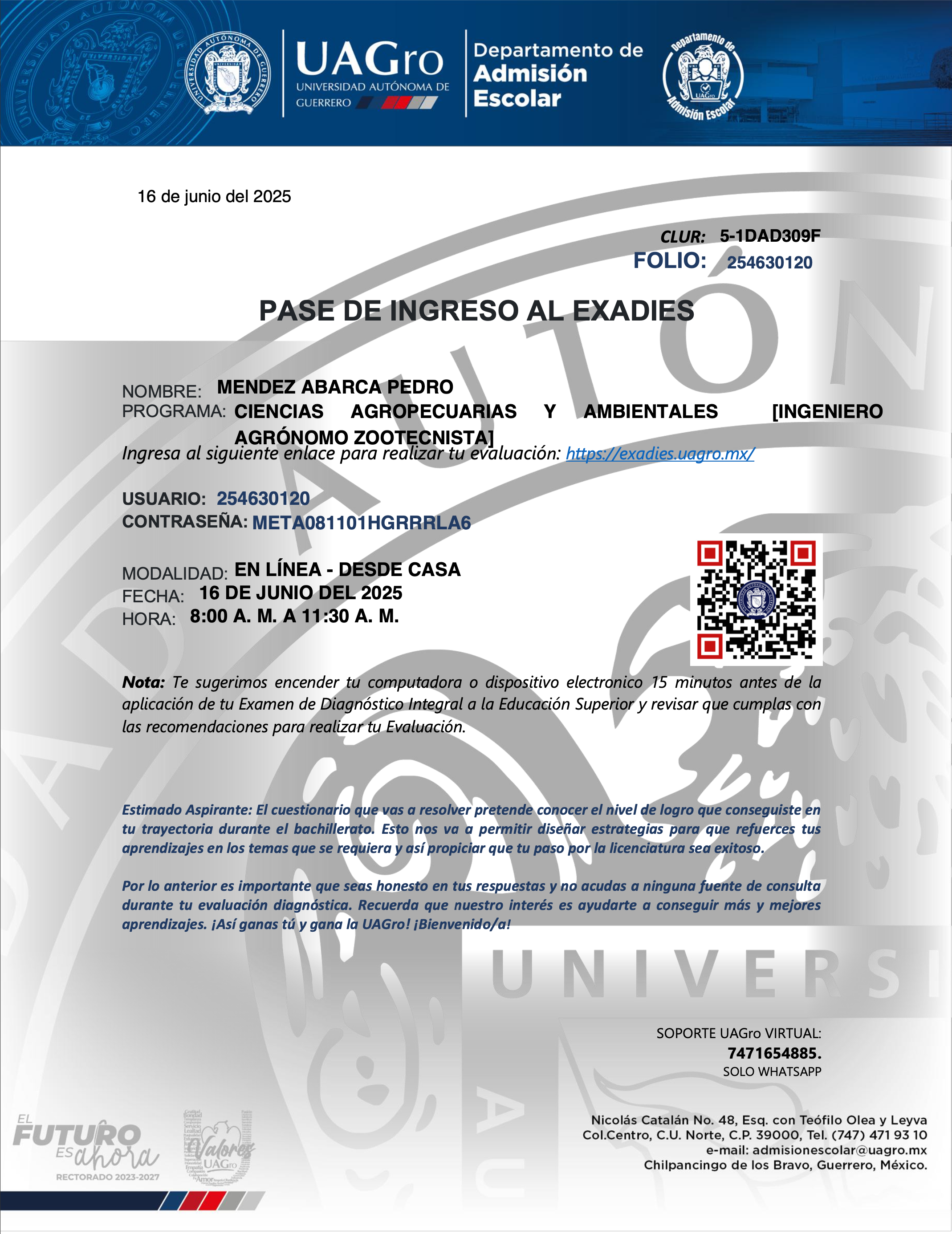 El aspirante obtendrá su usuario y contraseña al momento de descargar su Pase de Ingreso al Examen, considerando el Folio de su pase de ingreso como usuario y la CURP como contraseña, el cual le permitirá ingresar al EXADIES: https://exadies.uagro.mx/